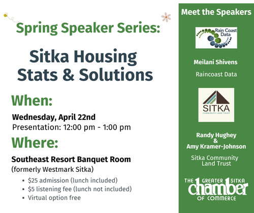 Join us for our Spring Speaker Series on Wednesday, April 22nd. Meilani Shivens from Raincoast Data will present data on Sitka's housing, its impact on our population decline, and how our number compare to other communities in Southeast. Next, Randy Hughey and Amy Kramer-Johnson, from Sitka Community Land Trust, will share and update on the progress they have made in housing development.